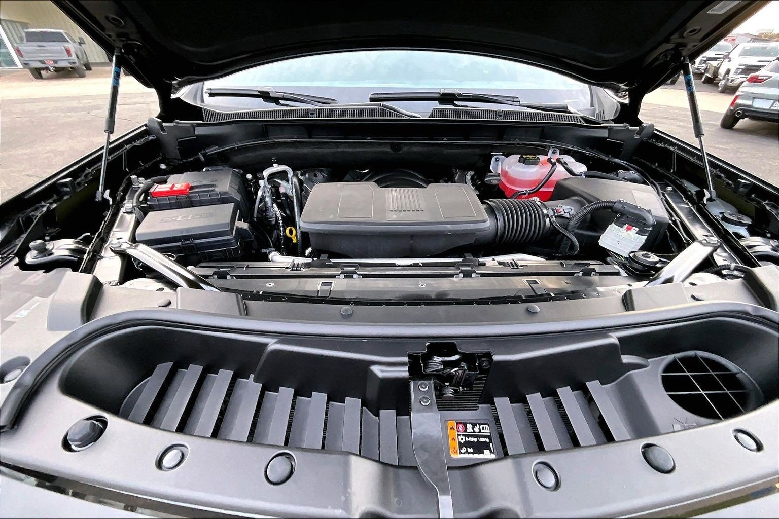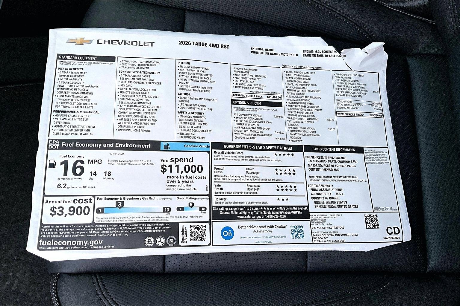 Black 2026 Chevrolet Tahoe RST 4WD 10-Speed Automatic with Overdrive EcoTec3 6.2L V8 4WD, Jet Black/Victory Red Leather, 1st and 2nd Row Color-Keyed Carpeted Floor Mats, 2-Speed Active Electronic AutoTrac Transfer Case, 2-Way Power Driver Lumbar Seat Adjuster, 2-Way Power Front Passenger Lumbar Seat Adjuster, 2nd Row Power Release 60/40 Split-Folding Bench Seat, 3-Spoke Wrapped Steering Wheel, 3.23 Rear Axle Ratio, 3rd Row 60/40 Power-Folding Split-Bench Seat, 3rd Row Manual 60/40 Split-Folding Bench Seats, 3rd row seats: split-bench, 4-Wheel Disc Brakes, 6 Speakers, 6-Speaker Audio System Feature, 8-Way Power Driver Seat Adjuster, 8-Way Power Front Passenger Seat Adjuster, ABS brakes, Advanced Trailering Package, Air Conditioning, Air Ride Adaptive Suspension, Alloy wheels, AM/FM radio: SiriusXM with 360L, Apple CarPlay/Android Auto, Auto High-beam Headlights, Auto-Dimming Inside Rear-View Mirror, Auto-dimming Rear-View mirror, Automatic temperature control, Blind Zone Steering Assist with Trailering, Bose 10-Speaker Centerpoint Surround Audio System Feature, Brake assist, Bright Front and Rear Door Sill Plates, Bumpers: body-color, Color-Keyed Carpeting Floor Covering, Comfort Package, Compass, Delay-off headlights, Driver door bin, Driver vanity mirror, Dual Exhaust System, Dual front impact airbags, Dual front side impact airbags, Dual-Pane Power Panoramic Sunroof, Electronic Stability Control, Emergency communication system: OnStar and Chevrolet connected services capable, Exterior Parking Camera Rear, Extra Capacity Cooling System, Floor Console, Floor Console with Storage Area, Four wheel independent suspension, Front anti-roll bar, Front Bucket Seats, Front Center Armrest, Front dual zone A/C, Front fog lights, Front LED Fog Lamps, Front reading lights, Frontal Driver and Outboard Passenger Airbags, Fully automatic headlights, Garage door transmitter, Heated 2nd Row Outboard Seats, Heated door mirrors, Heated Driver and Front Passenger Seats, Heated front seats, Heated Steering Wheel, Hill Descent Control, Hitch View with Pan/Zoom Image Adjustment, Illuminated entry, Integrated Trailer Brake Controller, Interior Camera, Key Card, LED Headlamps with LED Daytime Running Lamps, LED Tail Lamps, Low tire pressure warning, Magnetic Ride Control Suspension, Max Trailering Package, Memory seat, Memory Settings, Memory Settings For Driver, Navigation system: Google built-in compatibility (select service plan required, terms and limitations apply), Occupant sensing airbag, Outside Heated Power-Adjustable Mirrors, Outside temperature display, Overhead airbag, Overhead console, Panic alarm, Passenger door bin, Passenger vanity mirror, Perforated Leather Seat Trim, Power door mirrors, Power driver seat, Power Liftgate, Power passenger seat, Power Release 2nd Row Bucket Seats, Power steering, Power windows, Preferred Equipment Group 1SP, Premium audio system: Chevrolet Infotainment 3 Premium, Premium Smooth Ride Suspension, Radio data system, Radio: 17.7 Diagonal Advanced Color LCD Display, Rain sensing wipers, Rear air conditioning, Rear anti-roll bar, Rear Power Liftgate, Rear reading lights, Rear seat center armrest, Rear window defroster, Rear window wiper, Remote keyless entry, Remote Start, RST Capability Package, RST Exterior Features, Security system, Set of 4 Wheel Locks, SiriusXM with 360L Trial Subscription, Smart Trailer Integration Indicator, Speed control, Speed-sensing steering, Split folding rear seat, Spoiler, Steering wheel mounted audio controls, Tachometer, Telescoping steering wheel, Tilt steering wheel, Traction control, Trip computer, Universal Home Remote, USB Ports, Variably intermittent wipers, Voltmeter, Wheels: 22 x 9 Bright Machined, Wireless Phone Charging, 4WD, Jet Black/Victory Red Leather.